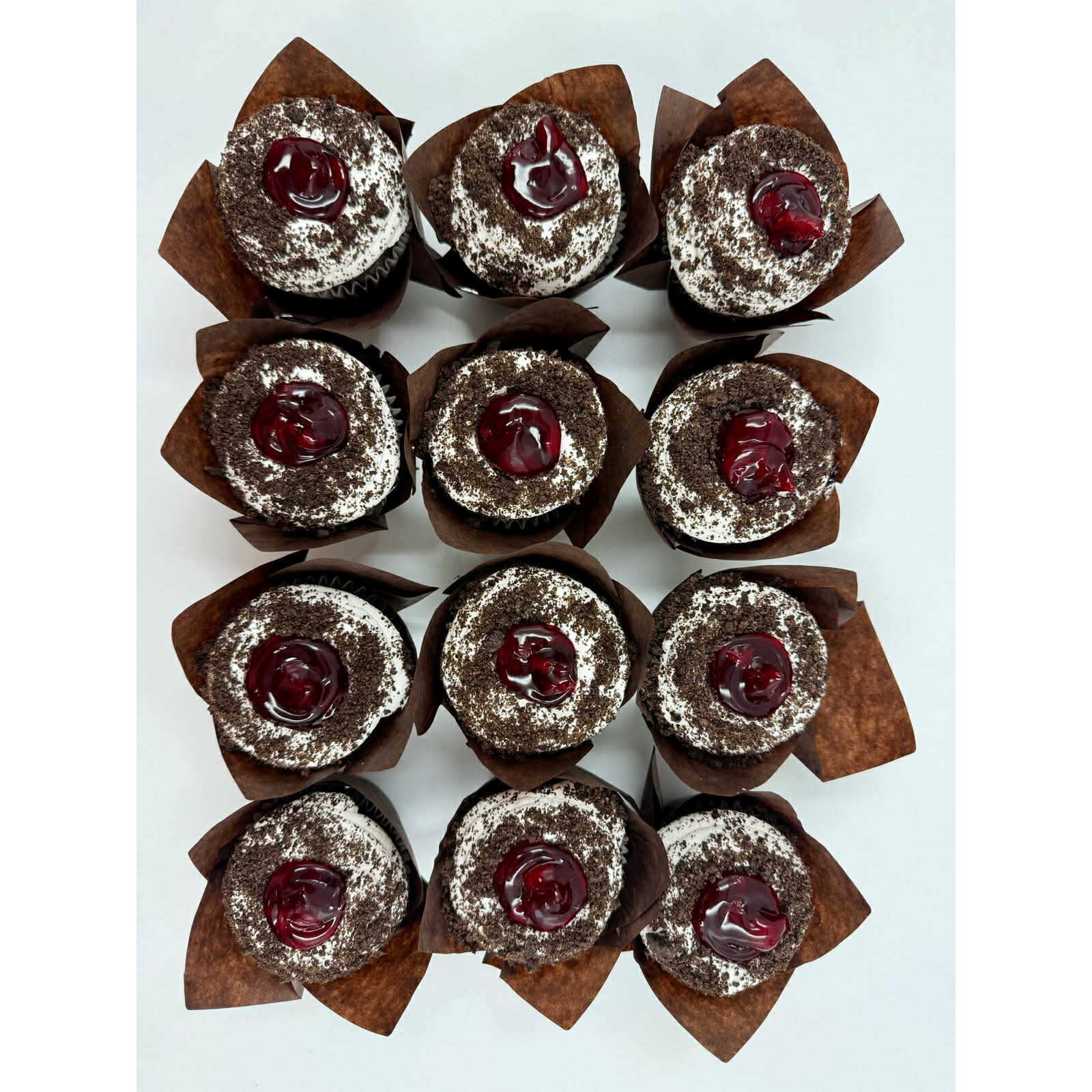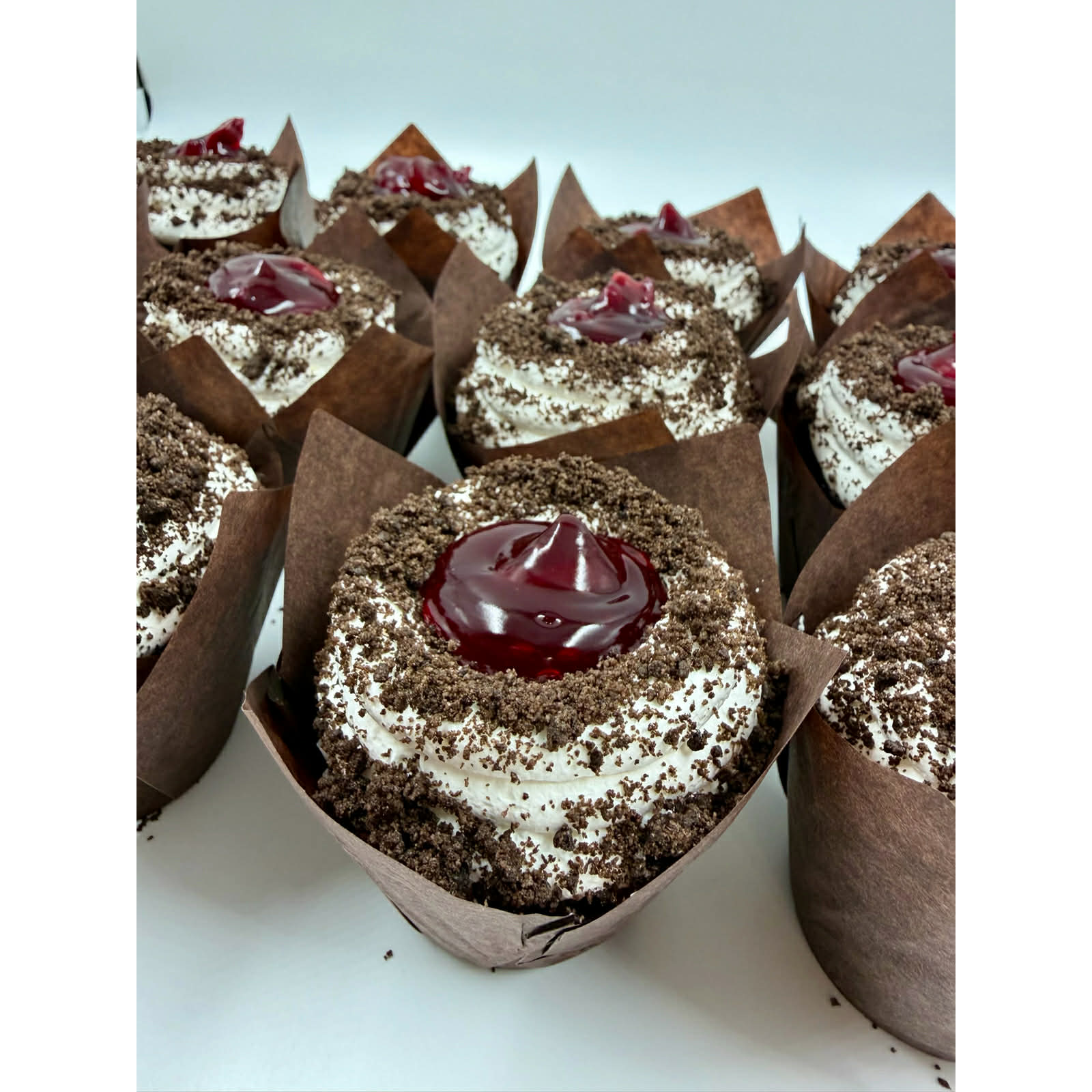 Chocolate cupcakes filled with cherry filling topped with whipped cream, Oreo crumbs, and cherry filling.