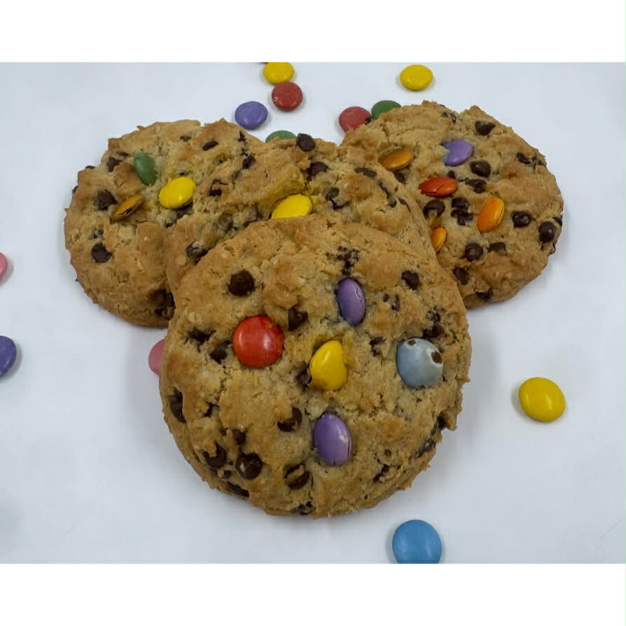 Oatmeal chocolate chip cookie with smarties.
